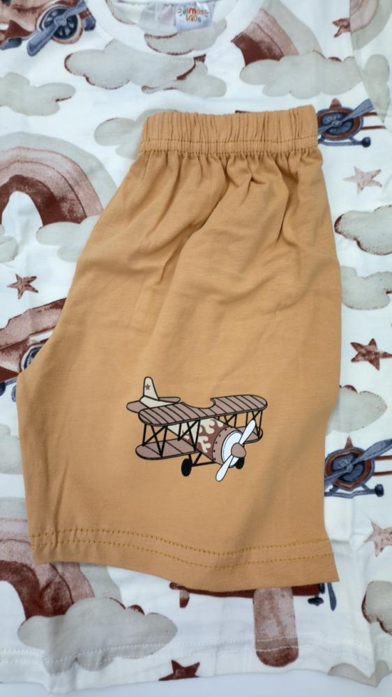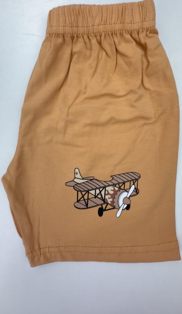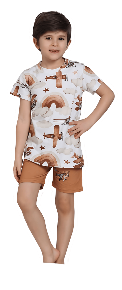 - الألوان المتاحة: أبيض مع رسومات ملونة متناسقة، وشورت بني أنيق.